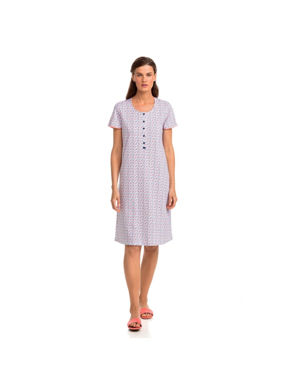 Pohodlná dámska nočná košeľa pre sladké spanie aj pre krásne chvíle. Nočná košeľa s jemným kvetinkovým vzorom je vyrobená z vysoko kvalitnej; genetický nemodifikované gréckej jersey bavlny; ktorá poskytuje vysoké pohodlie; príjemný pocit na dotyk; priedušnosť; pružnosť a odolnosť. Nočná košeľa má krátky rukáv; okrúhly výstrih a dlhú gombíkovú légu; takže je košeľa vhodná aj pre kojace mamičky. Dĺžka nočnej košele je 100cm.