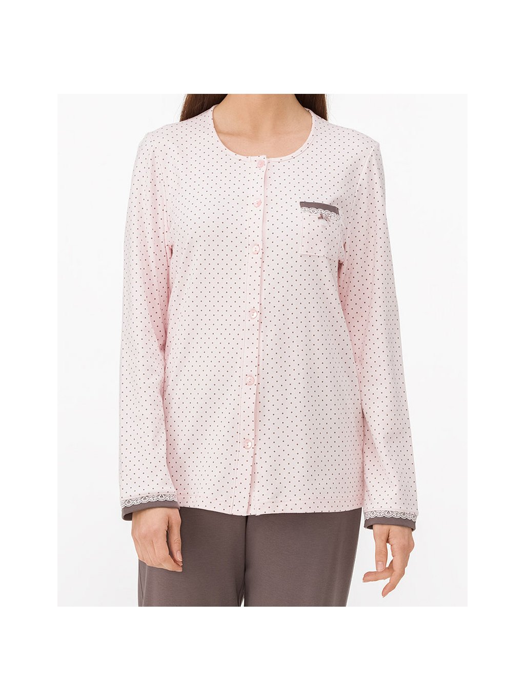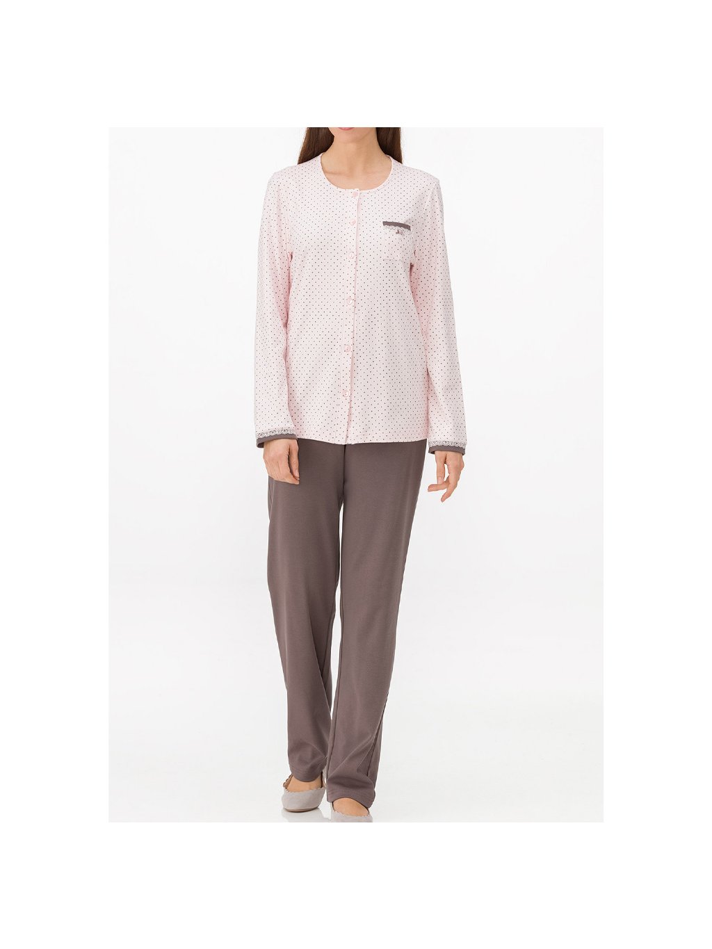 Dámske bavlnené pyžamo značky Vamp. Tento pyžamový set sa skladá z košieľky a nohavíc. Košieľka sa rozopína na gombíky; má okrúhly výstrih a náprsné vrecko. Je v príjemnej bledoružovej farbe s hnedými bodkami; ktoré sa hodia k nohaviciam na gumu. Pyžamo je príjemné a mäkké.