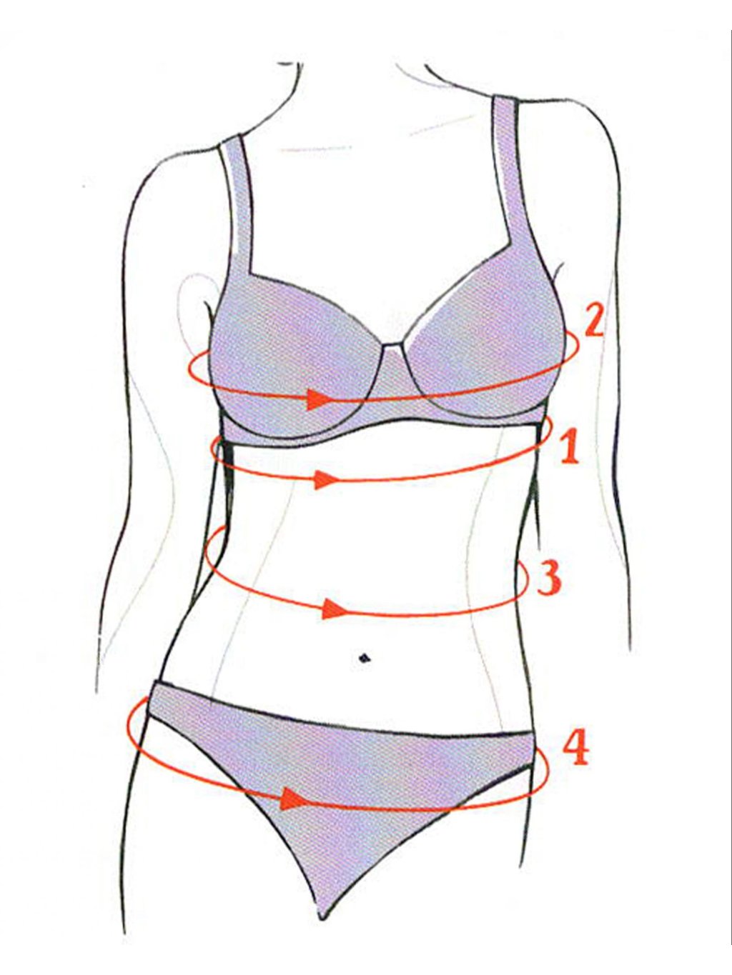 • obvod pod prsiami - meter držte priamo pod poprsím (1); zistená veľkosť udáva veľkosť obvodu podprsenky
