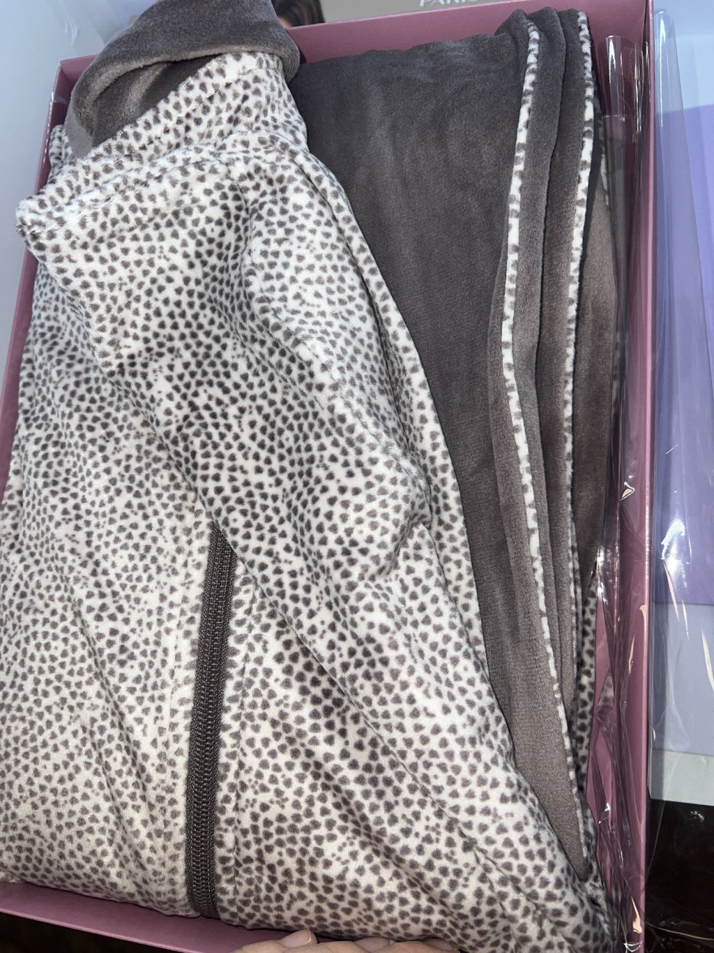 Domáca bunda s dlhým rukávom a zapínaním na zips po celej dĺžke a dlhé nohavice s manžetami, mäkký velúr s mikrotlačou.