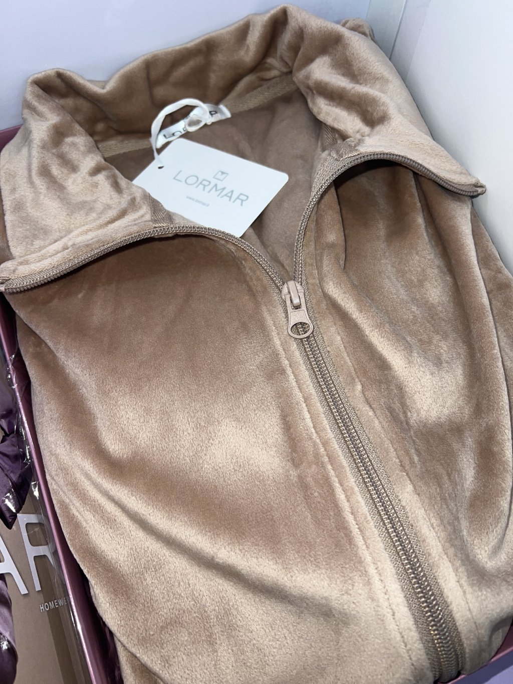Domáca bunda s dlhým rukávom a zapínaním na zips po celej dĺžke a dlhé nohavice s manžetami, mäkký velúr so zlatým gombíkom. VOĽNÝ ČAS