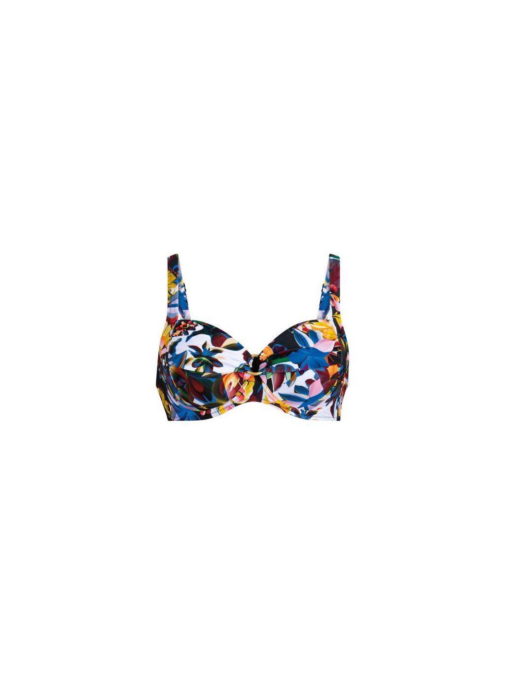 Tento vrchný diel bikín kombinuje štýl a funkčnosť. Vďaka špeciálnej podpore celého košíčka zaručuje optimálnu oporu a pohodlie. Nariasené volány dodávajú dizajnu ženský nádych, zatiaľ čo vysoko kvalitný kovový ozdobný krúžok dodáva nádych luxusu. Vrchný diel bikín, ktorý zaisťuje elegantný vzhľad na pláži aj pri bazéne. Nevystužená podprsenka zložená z viacerých dielov pre lepšiu pevnosť ( s kosticami )