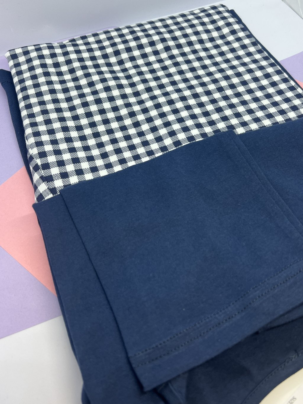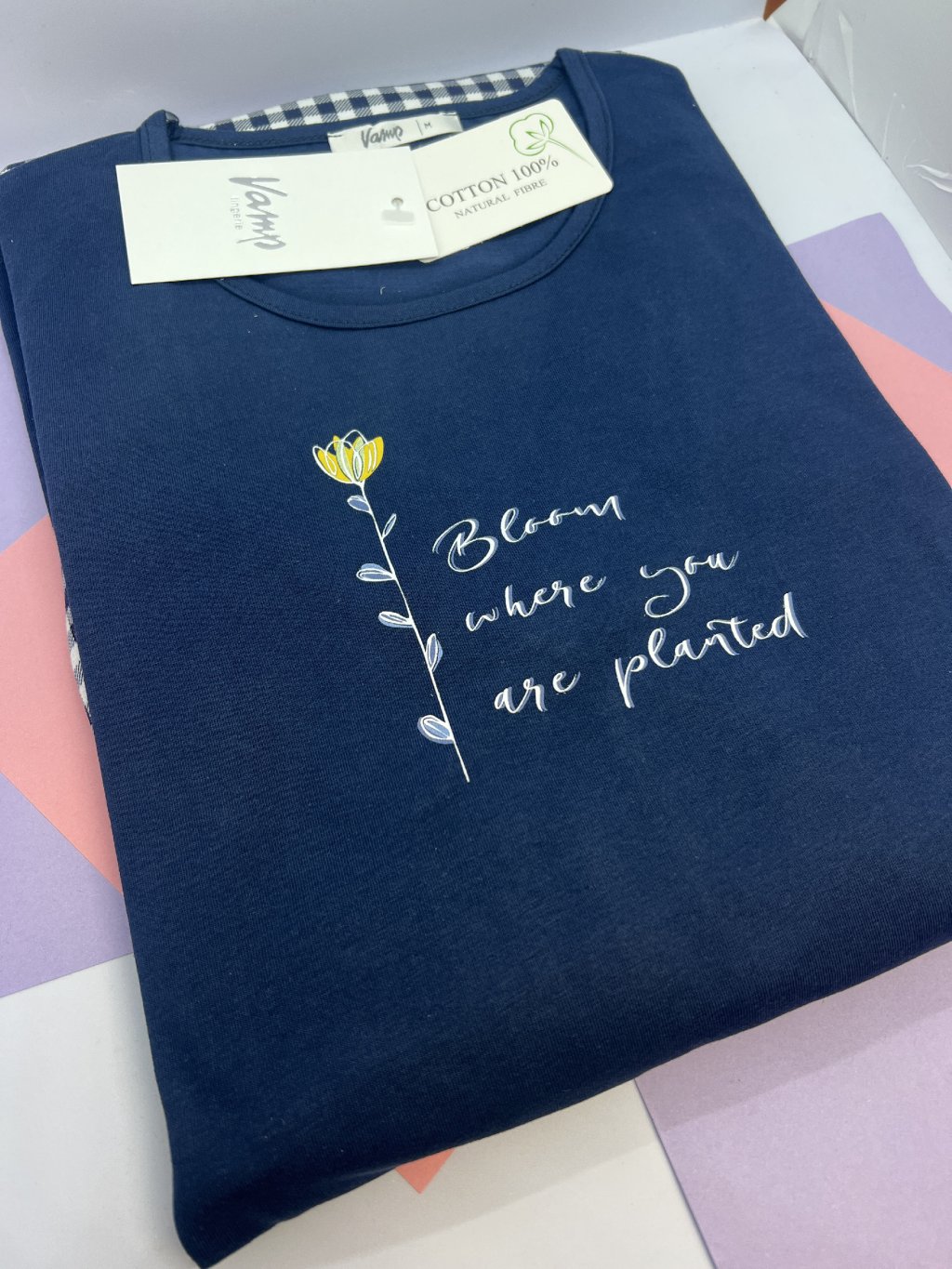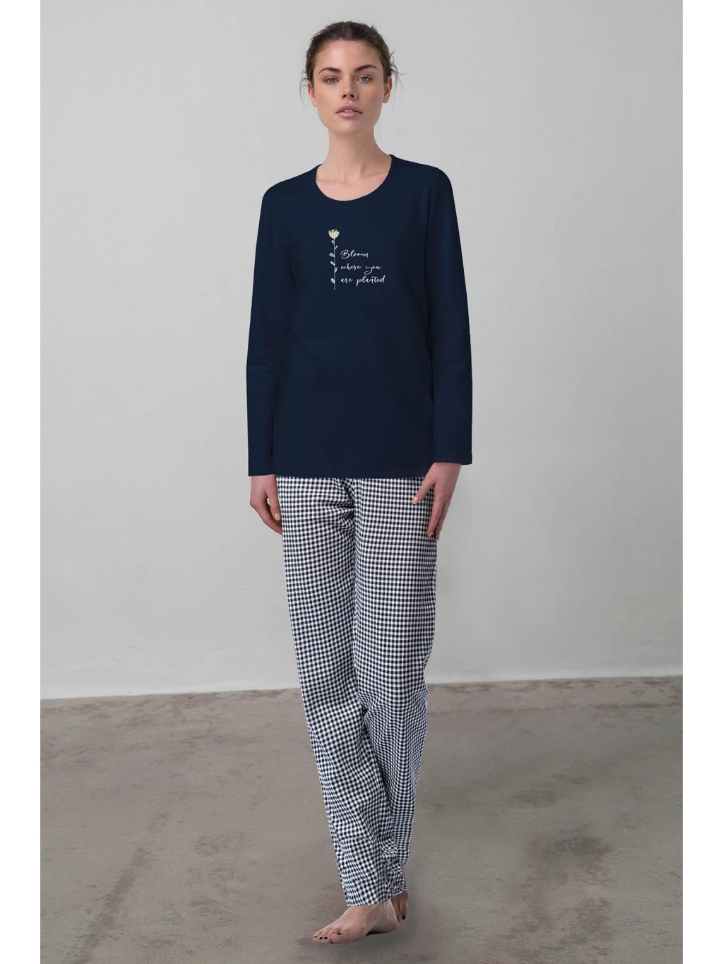 Dámske dvojdielne pyžamo s kvetinovým obrázkom na hrudi, okrúhlym výstrihom a dlhými károvanými nohavicami s pohodlným elastickým pásom. Pyžamo je vyrobené z kvalitnej bavlny bez GMO, ktorá poskytuje vysoký komfort, príjemný pocit, priedušnosť, pružnosť a odolnosť. Bez patentov.