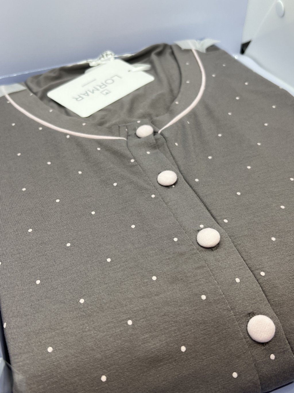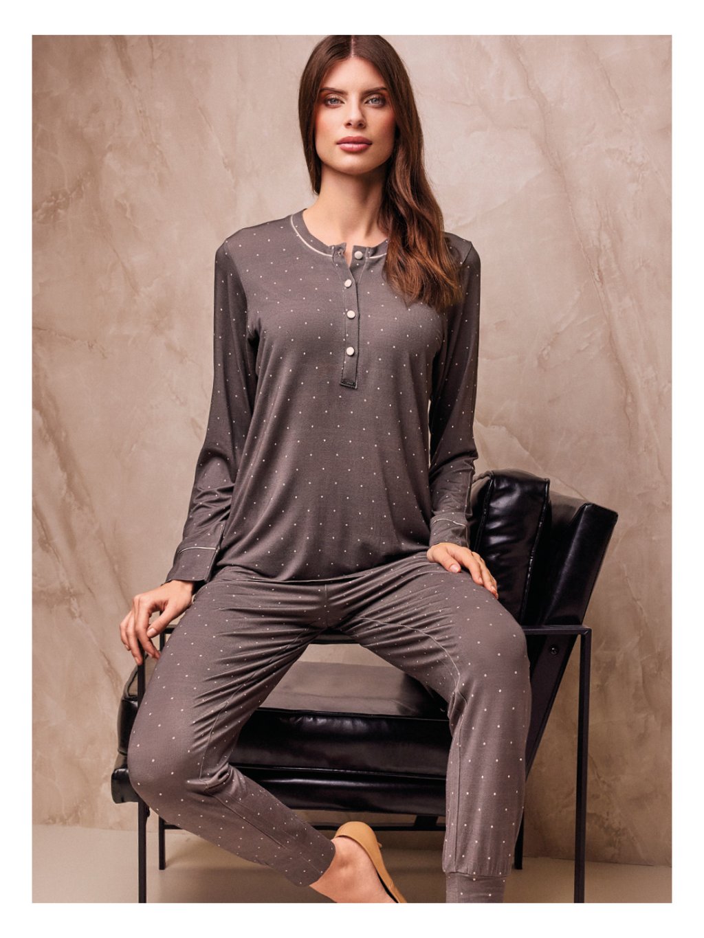 Luxusné dvojdielne dlhé pyžamo, po celej ploche vzor drobných bodiek a kvietkov vo vintage štýle. Spodný diel je ukončený patentom.