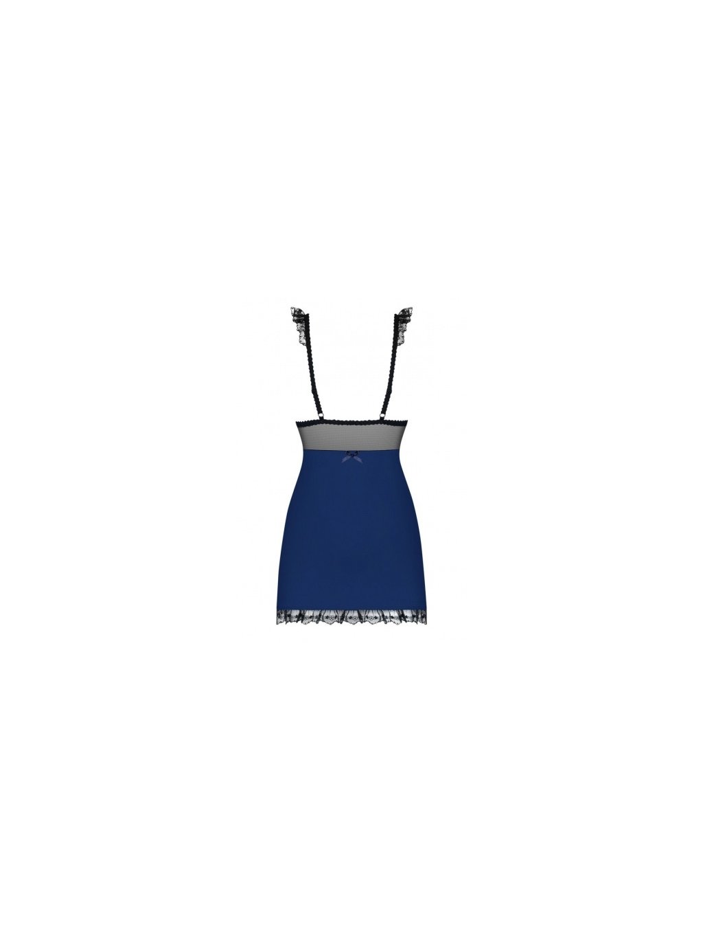 Elegantný set značky Obsessive tvorí košieľka a tangá. Košieľka má zmyselný dizajn; je vyrobená z príjemného elastického materiálu. Ramienka sú dĺžkovo nastaviteľné lemované nariasenou čipkou. Výstrih a spodný lem je zdobený čipkou. Časť košíkov je z priehľadnej sieťoviny a zvyšok z hladkej látky. Dekolt je ozdobený saténovou mašličkou a lesklou ozdobou.