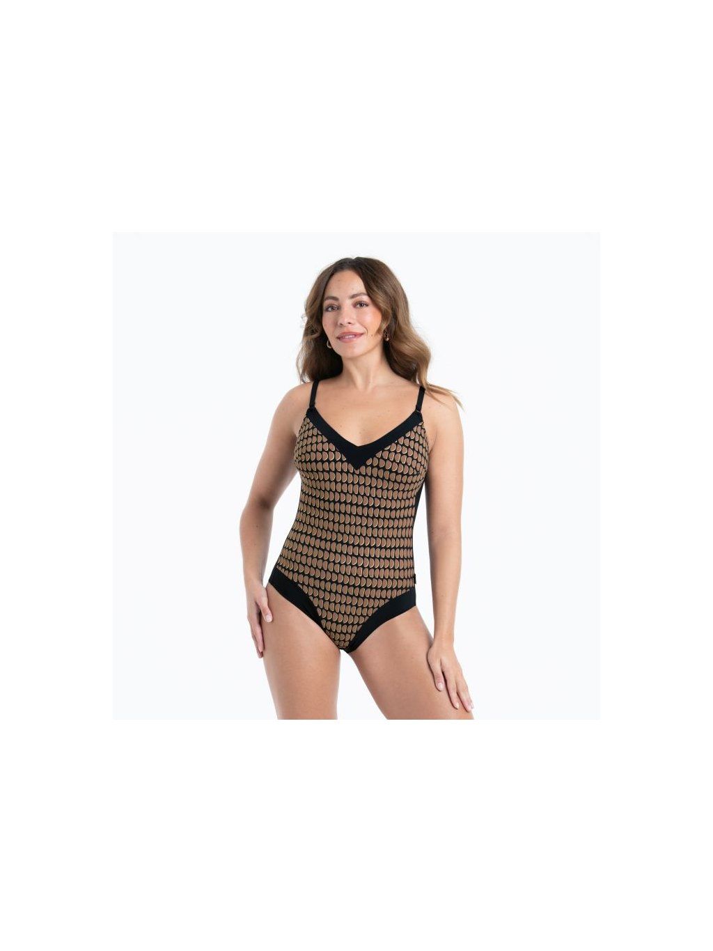 Plavky MABELA sú jednodielne s hladkým vnútorným košíčkom. Výstrih do V má lem a zoštíhľujúce panely na nohaviciach pre ženskú siluetu. Tieto plavky lichotia postave. Majú tenké posuvné ramienka, jemne vystužené košíky- všité. Plavky sú bez kostíc.