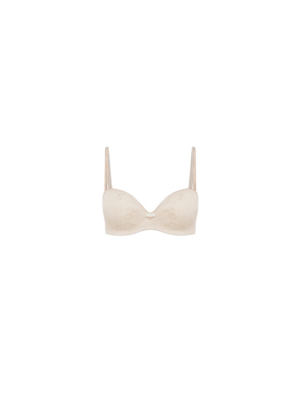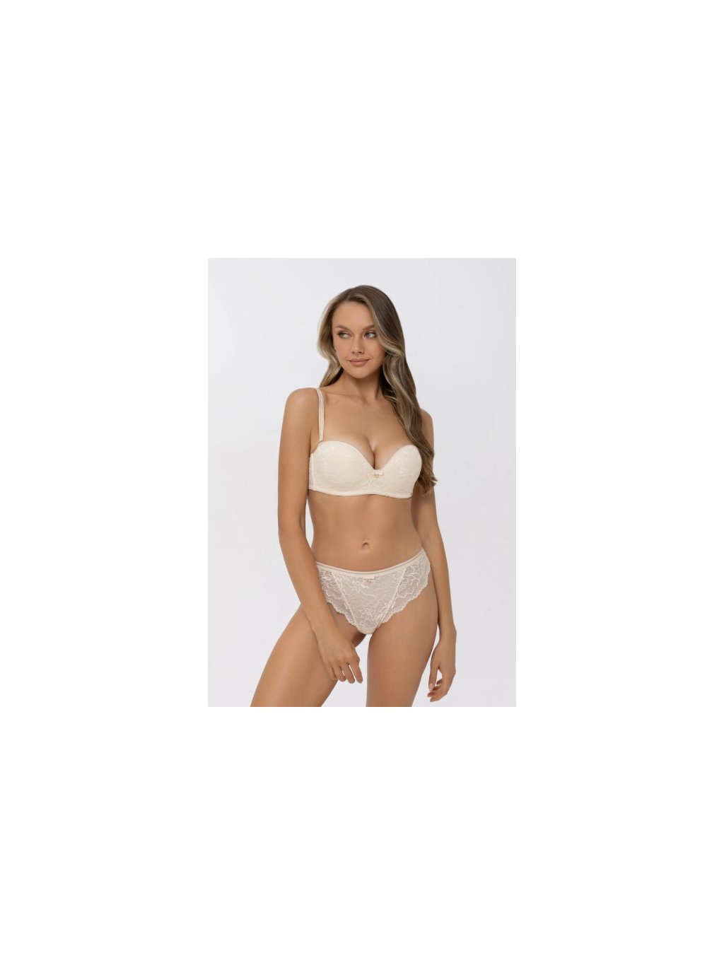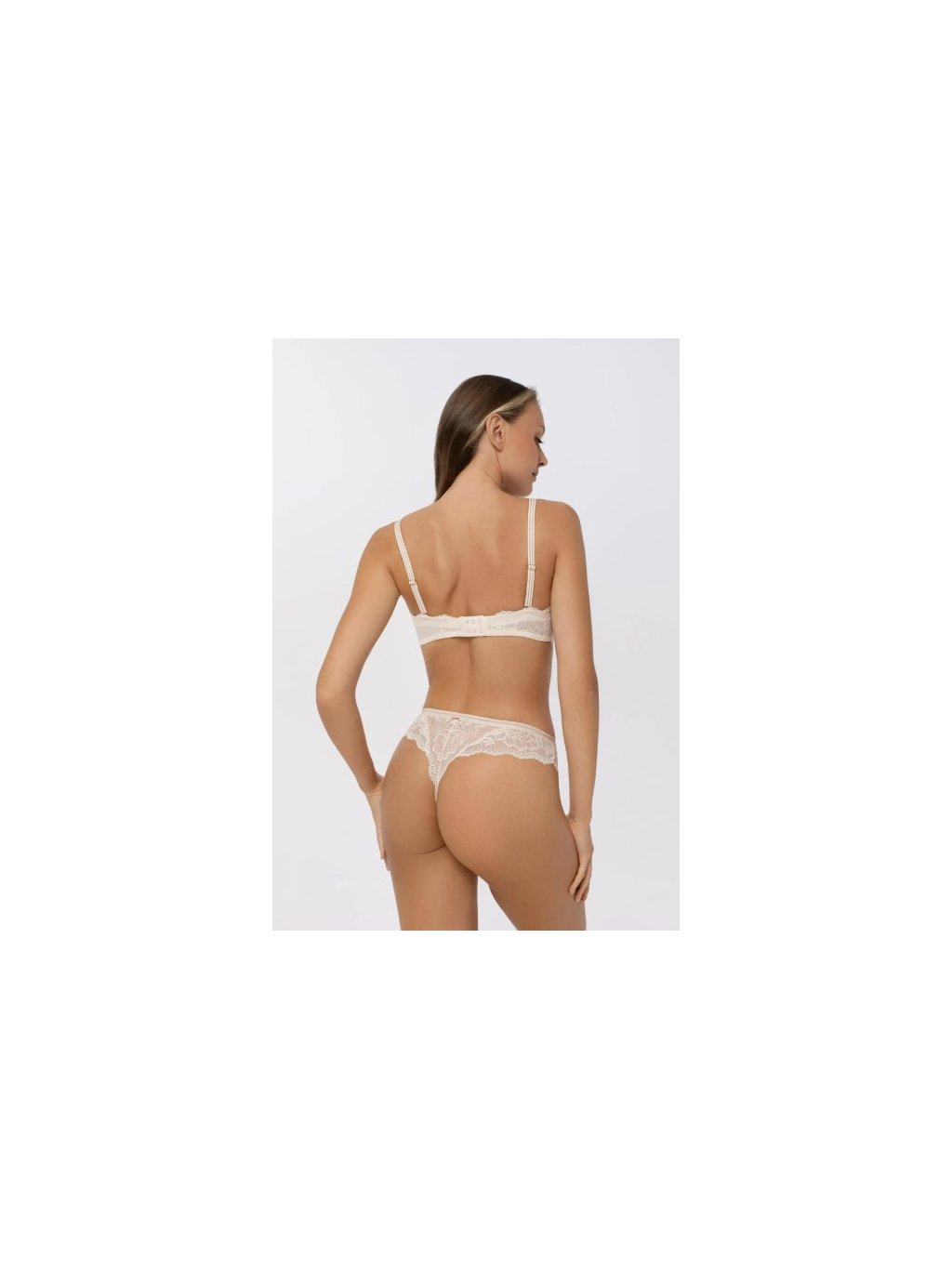 Krémové sny zo série DREAMER sa stanú skutočnosťou nie bez špeciálnych výrazových prostriedkov, ktoré tak milujú dizajnéri Marc & André: luxusná elastická čipka – najkrémovejšej farby! – lemovaná jemným lemovaním a úzkou elastickou páskou so zlatou niťou, miniatúrne doplnky v ružovo-zlatej farbe. Úzke ramienka, koketné mašle a efektné zaväzovanie – aká štedrá hostina v sladkom štýle s bezchybným vkusom! Tvarovaná push-up balconetková podprsenka bez kostíc s mäkkým plastovým rámom pre bočnú oporu a s odnímateľnými ramennými ramienkami. Dodatočná sada silikónových ramienok.