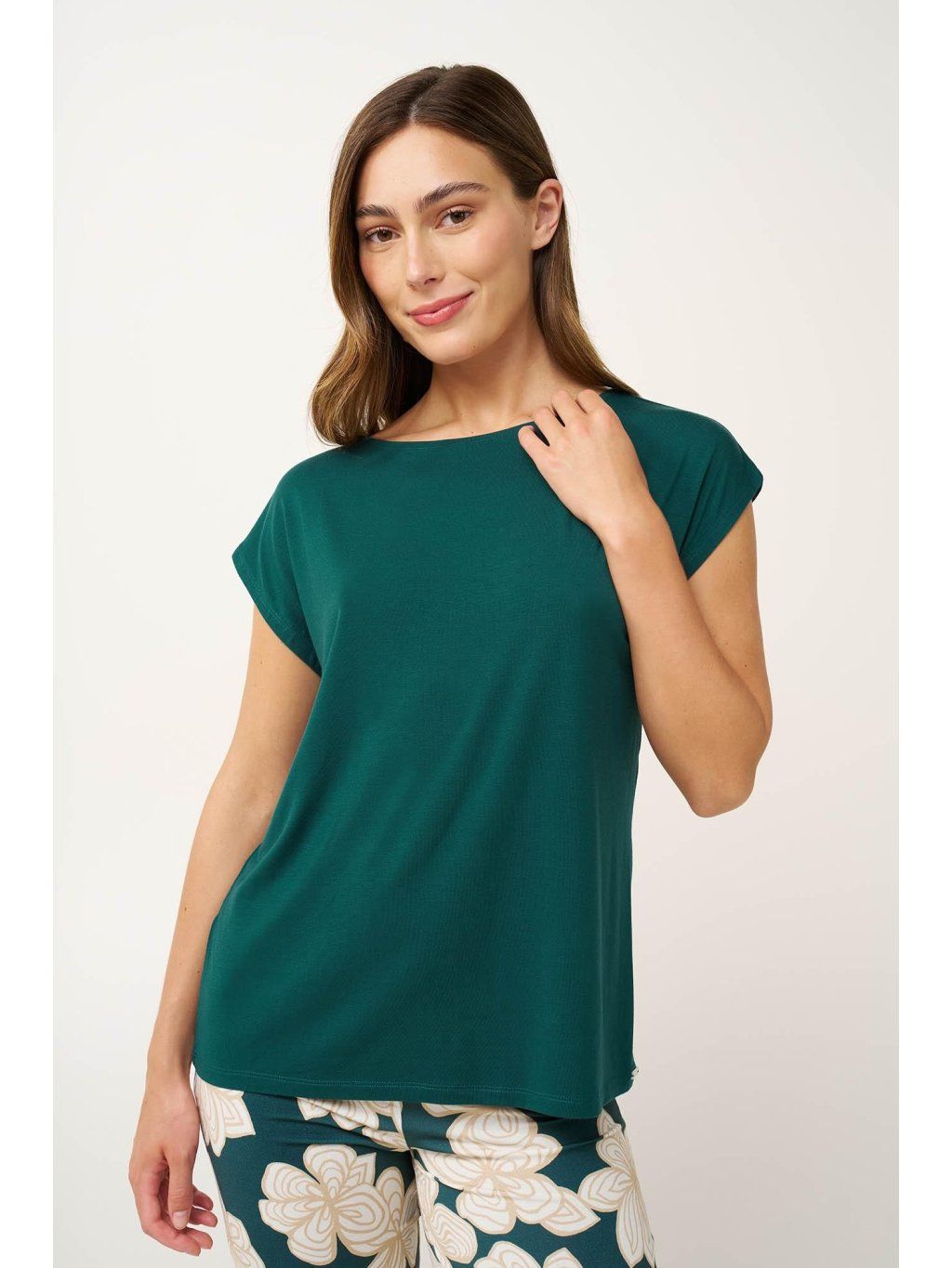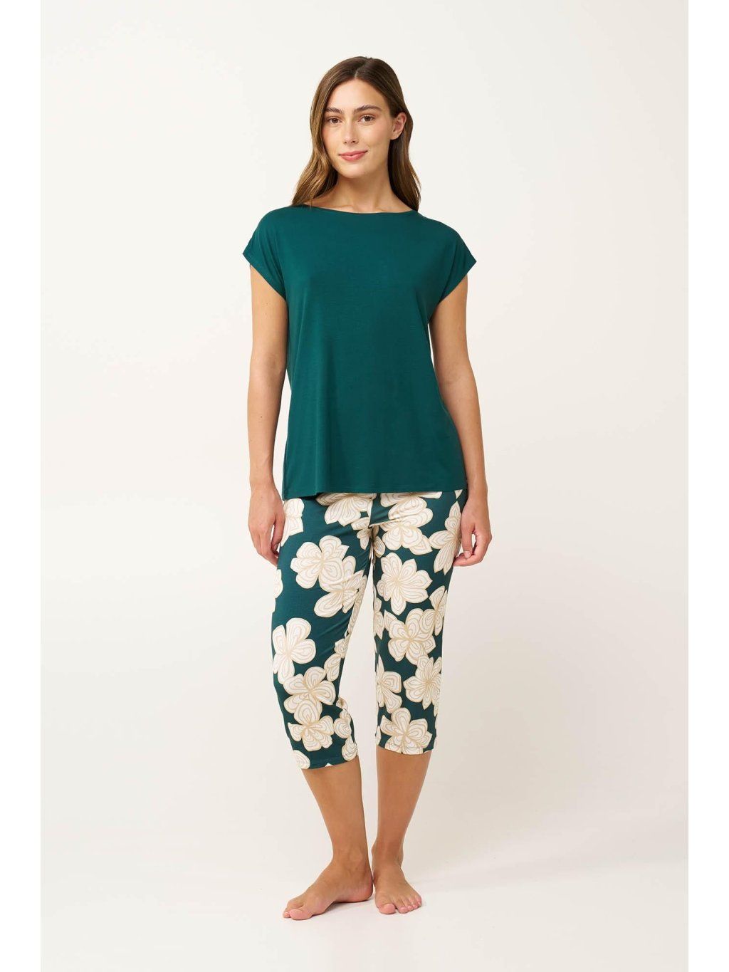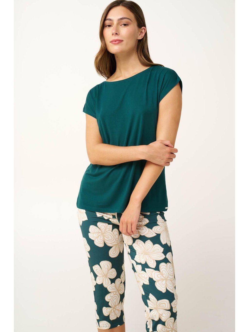 Užite si letné noci v elegantnej dámskej pyžame v zelenej farbe s jemným kvetinovým vzorom. Jednoduchý top s lodičkovým výstrihom a krátkymi rukávmi sa dokonale hodí ku capri nohaviciam s kvetinovými motívmi. Pyžamo je vyrobené z materiálu LENZING Tencel Modal Micro, ktorý je mimoriadne mäkký, ľahko splývavý a zaručuje celodenné pohodlie. Dokonale sa hodí na pohodové večery aj pokojný spánok.