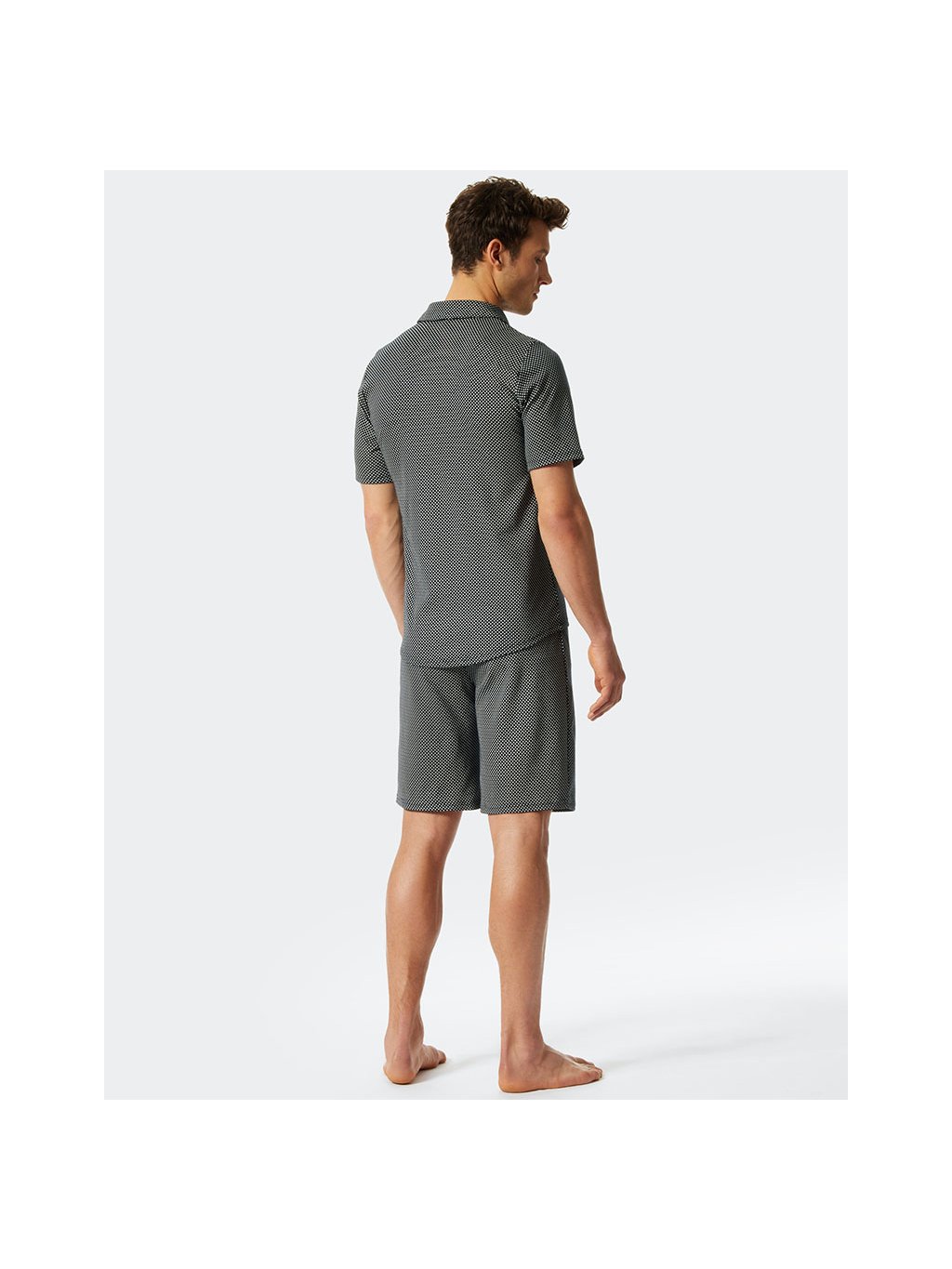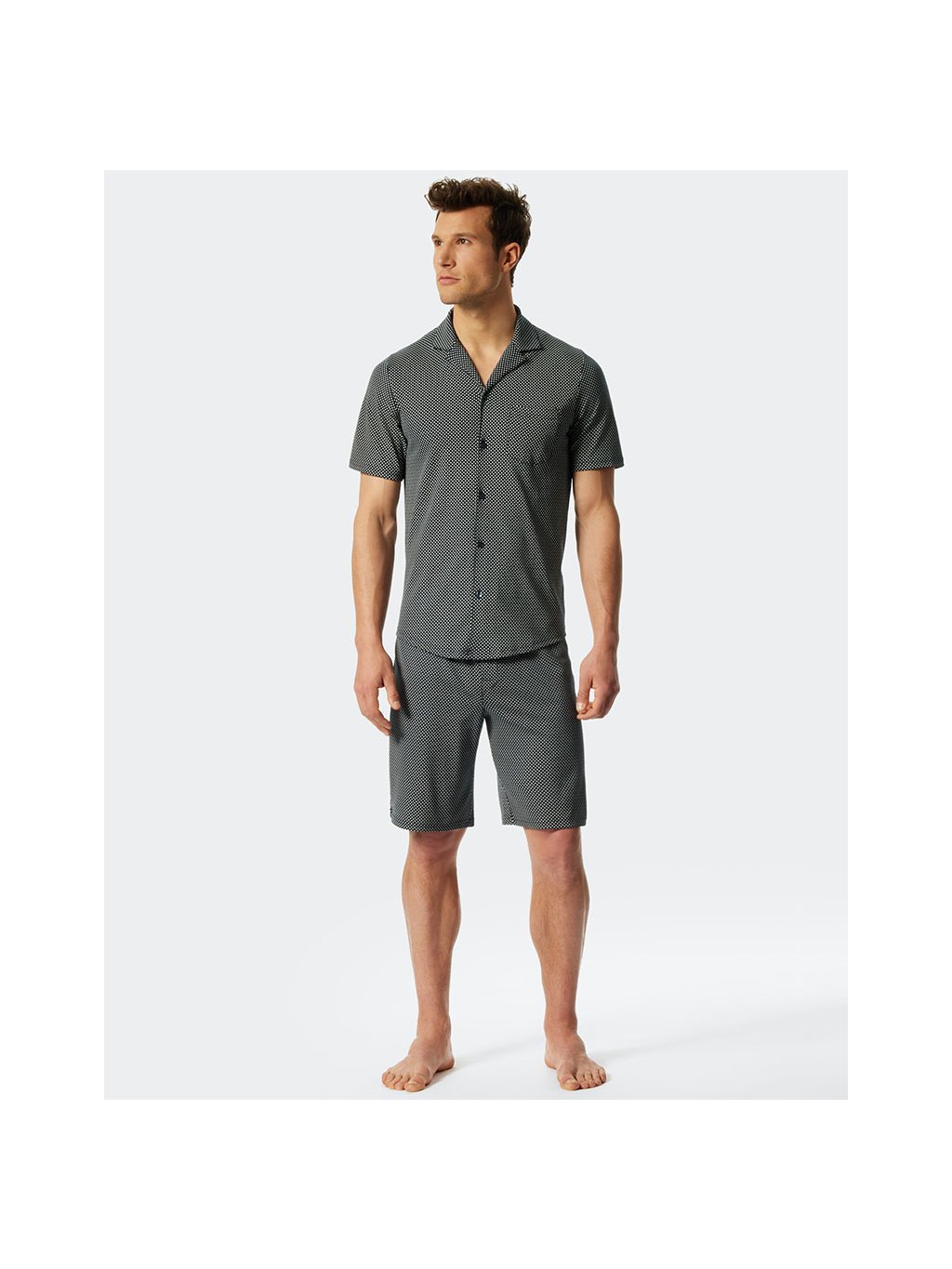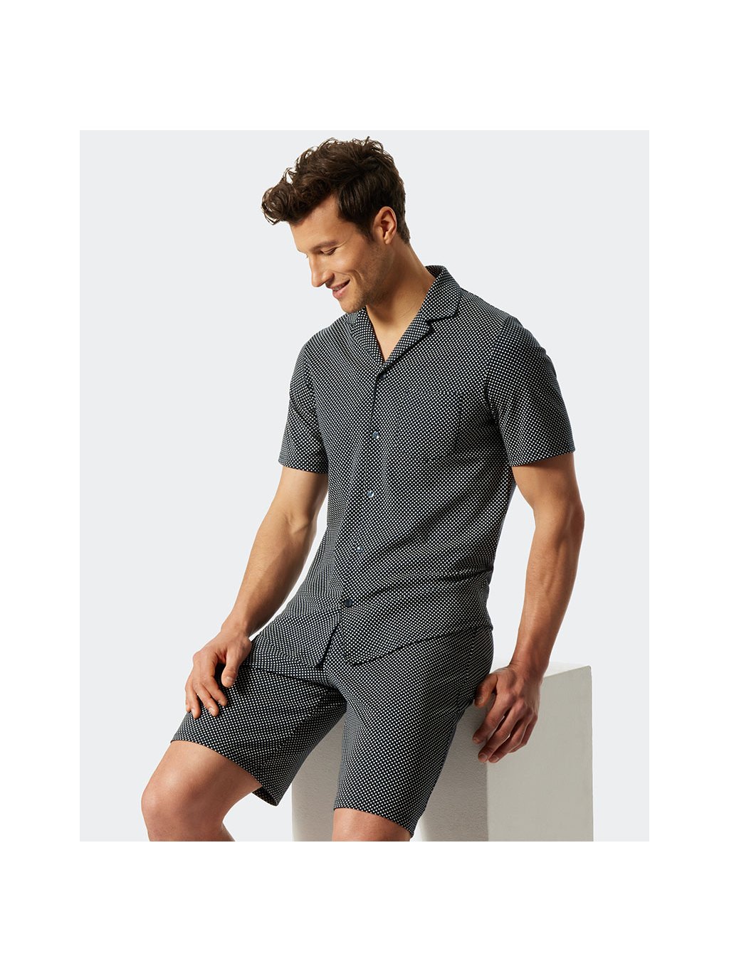 Elegantné krátke pyžamo s miniatúrnym vzorom srdiečok. Pyžamo je vyrobené z jemného úpletu. Tričko má klasický golier; gombíkovú légu a našité náprsné vrecko a nohavice majú po bokoch malé vrecká.