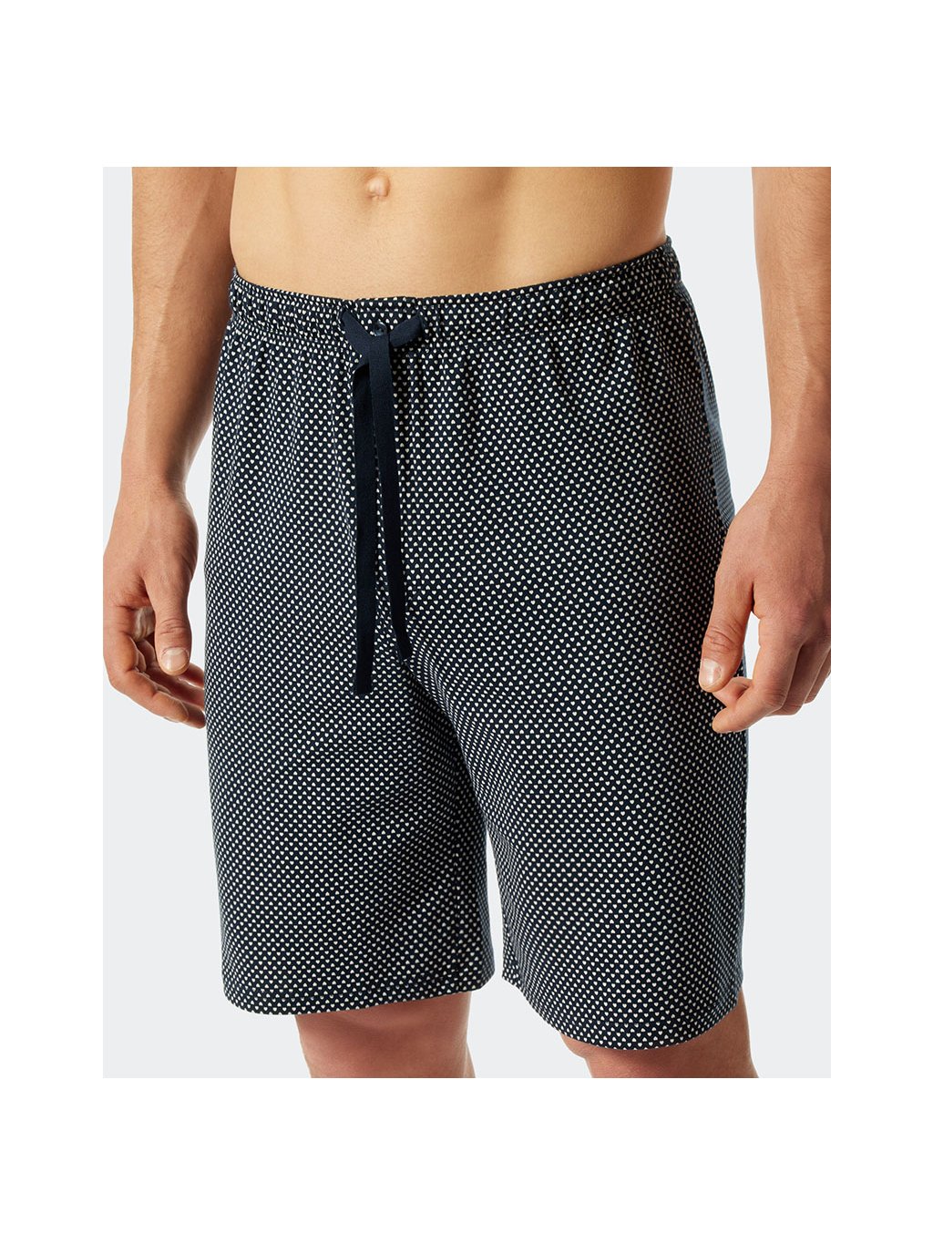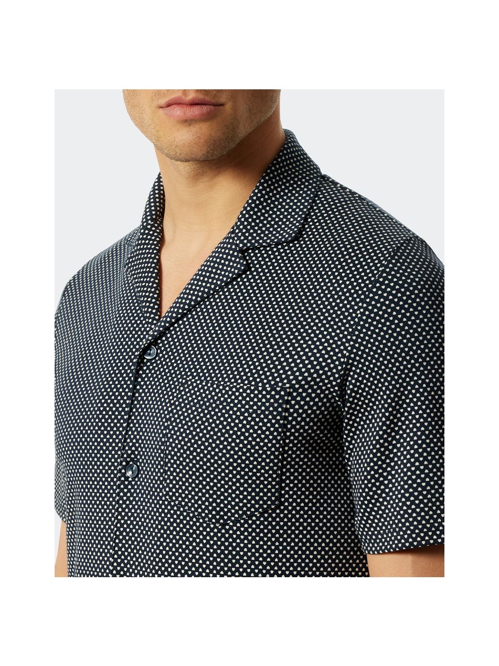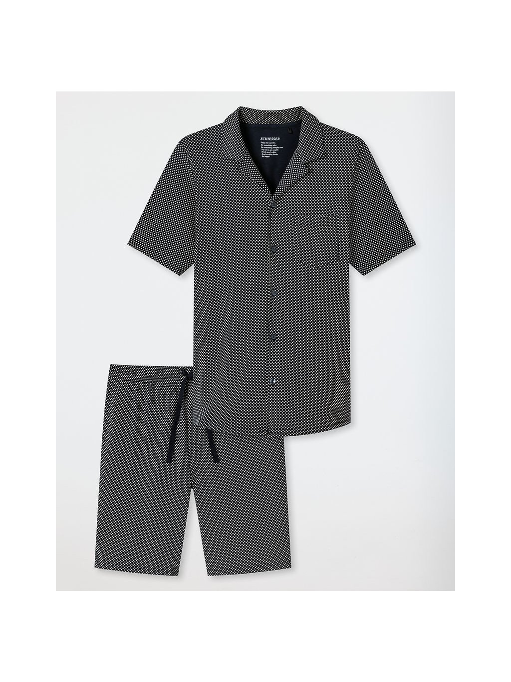 Elegantné krátke pyžamo s miniatúrnym vzorom srdiečok. Pyžamo je vyrobené z jemného úpletu. Tričko má klasický golier; gombíkovú légu a našité náprsné vrecko a nohavice majú po bokoch malé vrecká.
