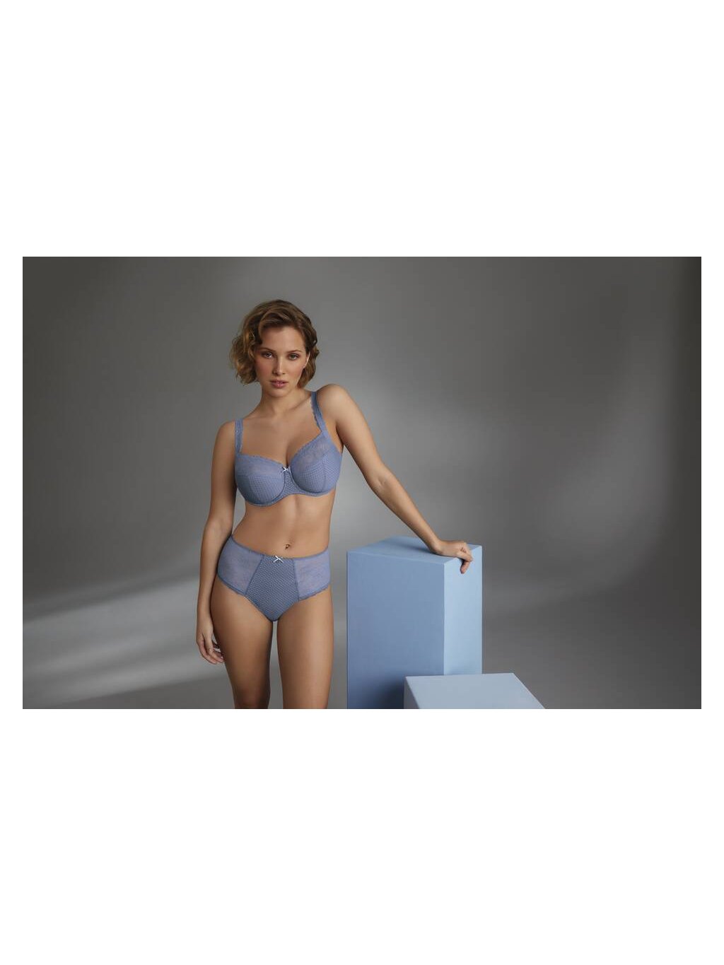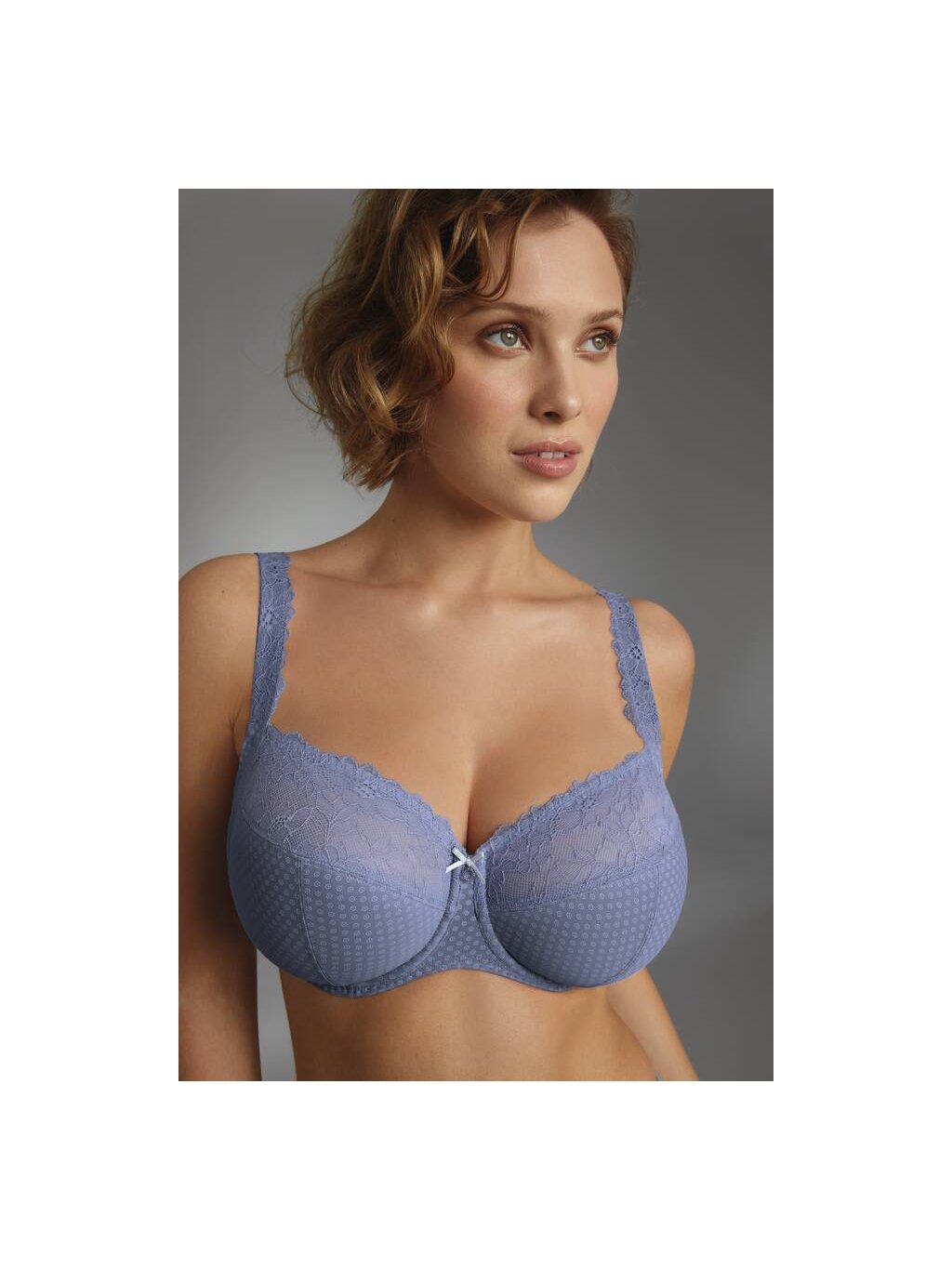 Tvarovaná podprsenka s plnými košíkmi, štvordielnymi košíčkami a podporným rámom. Kvetinová čipka z recyklovanej priadze, vystužený chrbát a elegantný ozdobný krúžok so saténovou mašľou zaisťujú oporu, pohodlie a ženskú eleganciu – aj vo väčších veľkostiach. Podrsenka je nevystužená , podšitá pre lepšiu pevnosť a podporu, má kostice.