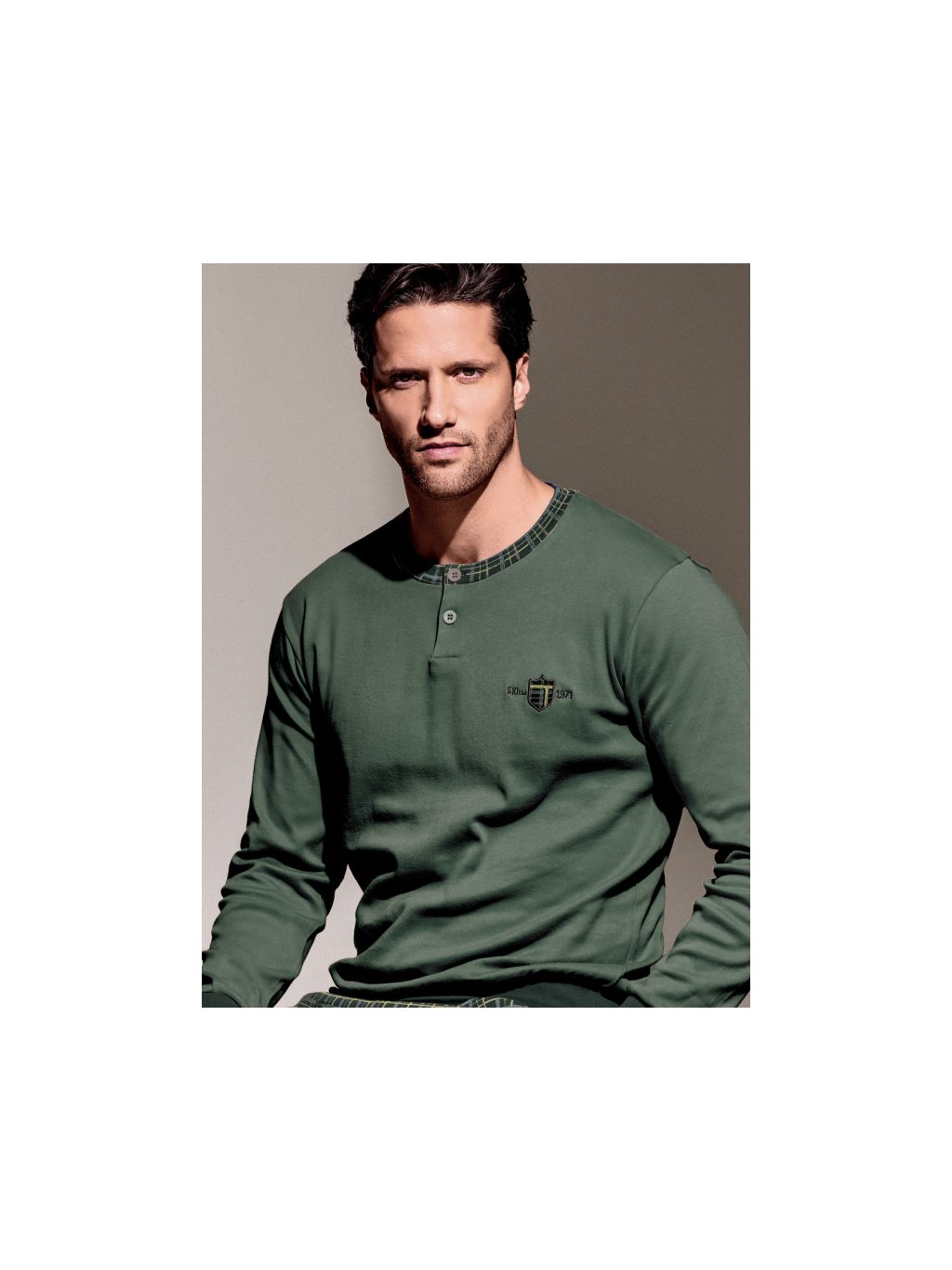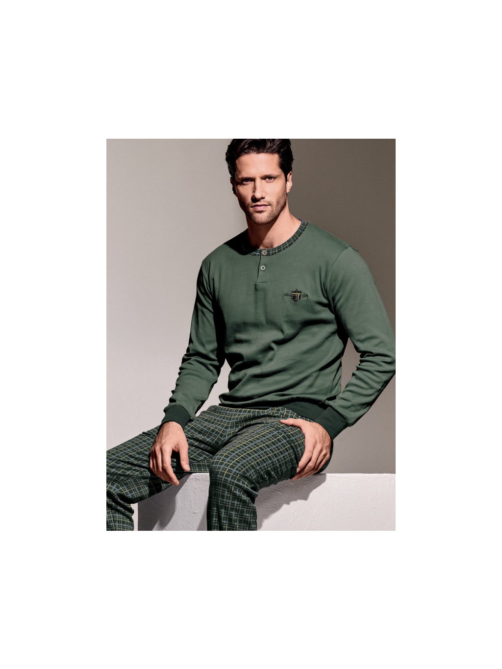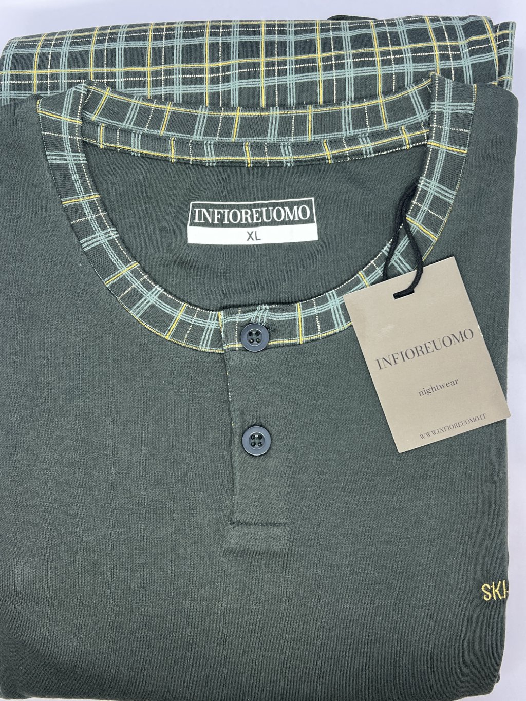 Pyžamo s dvojitej bavlny (interlock) s dlhým rukávom ukončeným patentami. Dlhé nohavice sú s kockovanou potlačou , dolu ukončené tiež na patenty. Séria MOUNTAIN.  Talianska značka Infiore. Pyžamo je balené v papierovej krabičke, vhodné aj ako darček.