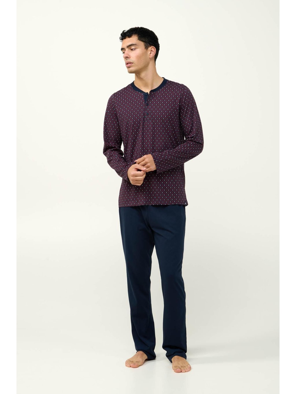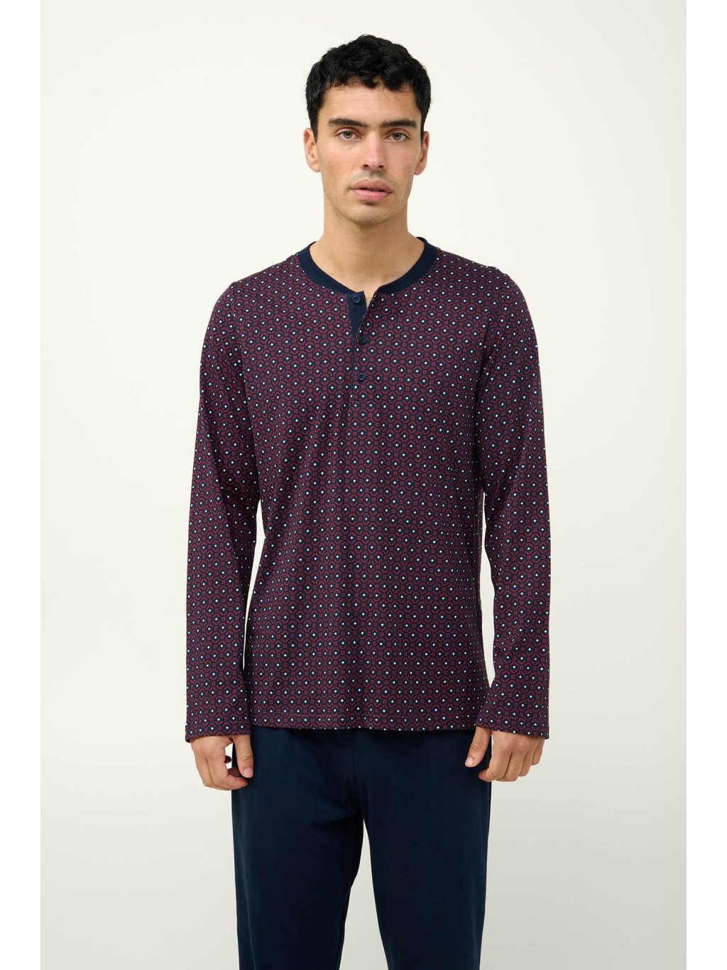 Vyskúšajte dokonalú kombináciu pohodlia a štýlu s týmto pánskym zimným pyžamom. Je vyrobené zo 100% bavlneného s. jersey a poskytuje mäkký a priedušný pocit na pokožke. Vrchný diel s gombíkovou légou má geometrickú potlač dlaždíc pre klasický a zároveň moderný vzhľad, v kombinácii s hladkými nohavicami pre vyvážený štýl. Táto súprava je navrhnutá pre relaxáciu, je ideálna na leňošenie alebo spánok a zaistí vám pohodlie vo chvíľach odpočinku.