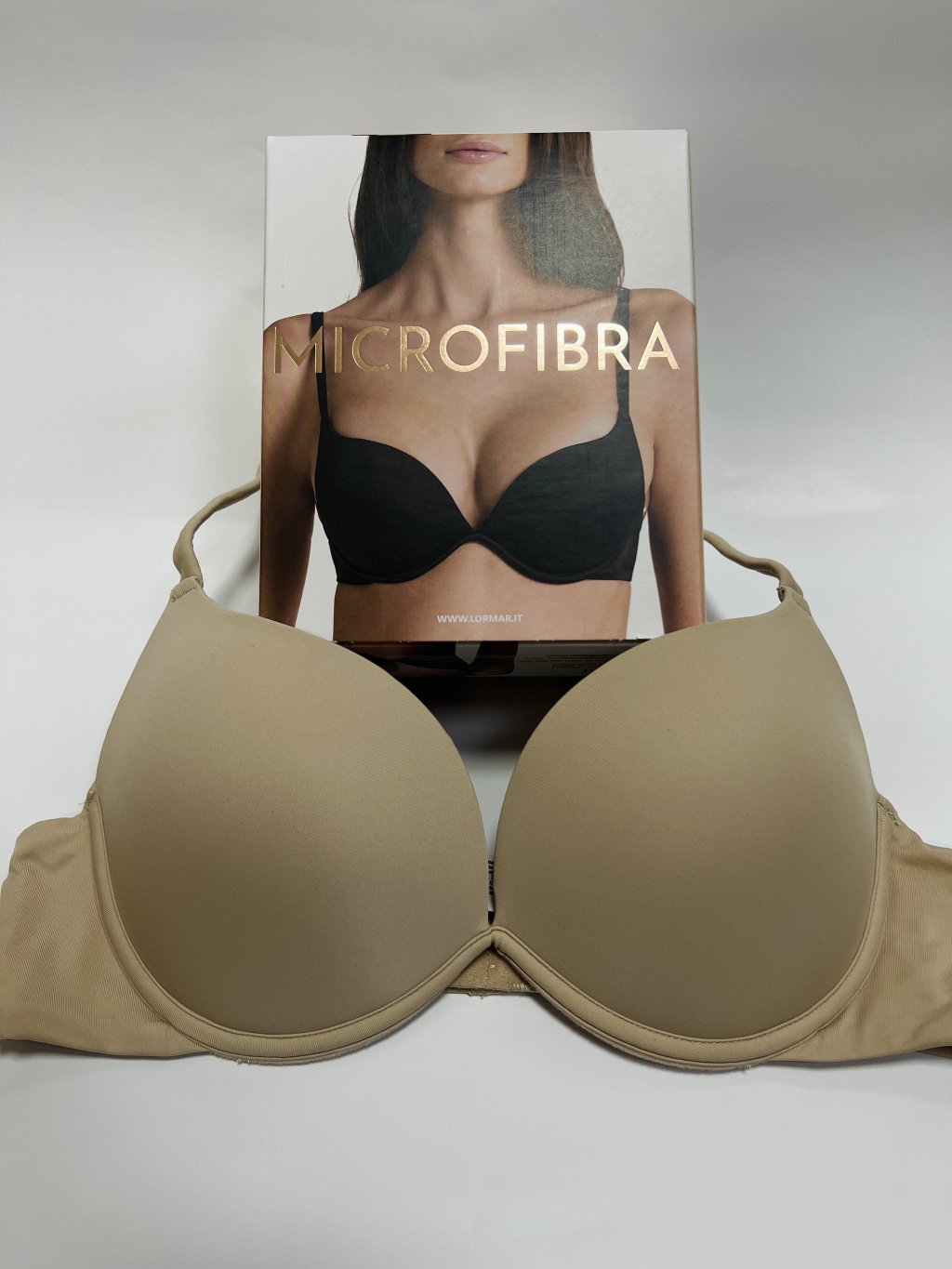 Elegantná hladká push - up podprsenka z novej kolekcie od značky Lormar. Podprsenka je zo špeciálneho jemného mikrovlákna "Velour efect", ktorý je zapracovaný a zdvojený tak, že nedochádza vôbec ku kontaktu textilných gúm a kože. Vnútorná časť košíkov je sformovaná pre push-up efekt penovou výstužou.