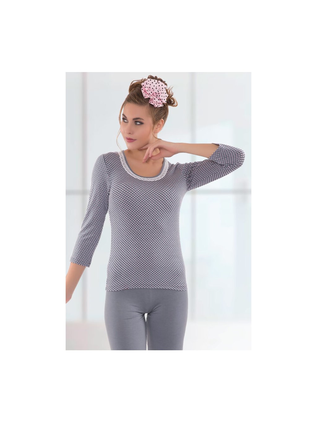 Dámska nočná košeľa značky Secret je vzorovaná viskózová košeľa doplnená o elastan. Nočná košeľa je jemne obtiahnutá; siaha pod stehná; má trojštvrťové rukávy ukončené riaseným lemom. Okrúhly výstrih je doplnený o čipku; ktorá sa nachádza aj na leme spodnej časti tejto nočnej košele. Nočná košeľa je bodkovaná a pohodlná na nosenie.